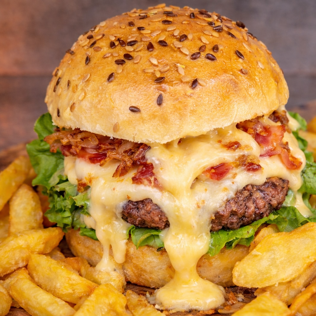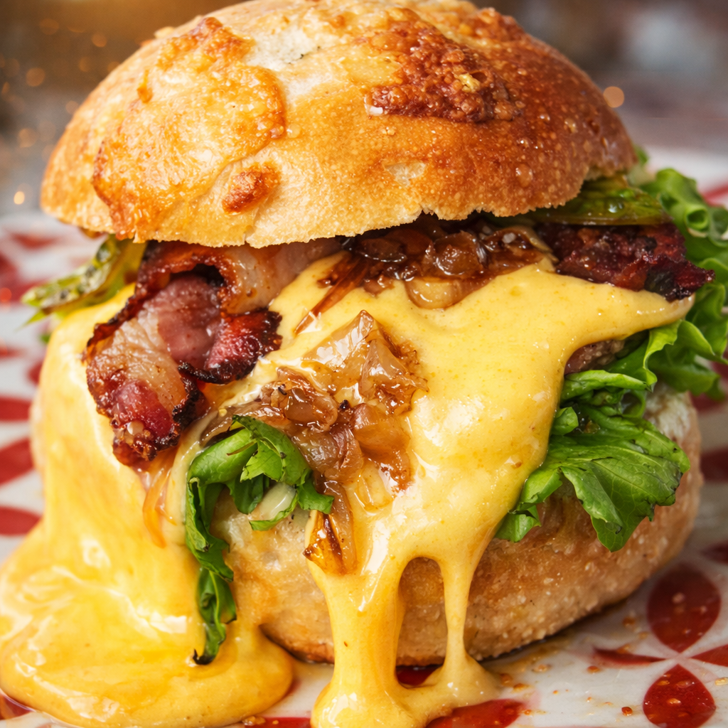 Les ingrédients : Pain du boulanger, Steak bio de la « Ferme du Crêt Joli », sauce crémeuse au Reblochon AOC, oignons crispy, bacon, salade fraîche, cornichons aigre-doux, sauce Mik-Mak