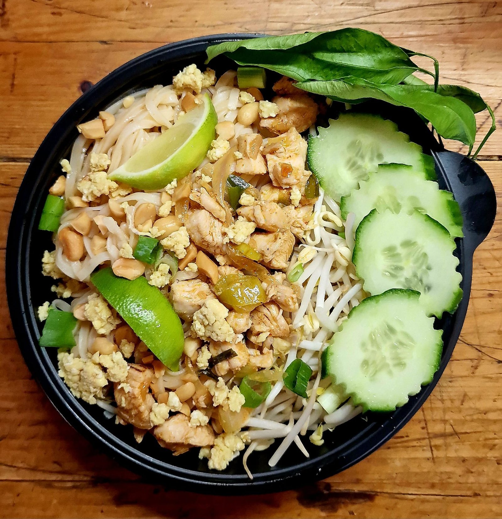 Un sauté de nouilles de riz et de poulet dans une sauce tamarin sucré-salé, des œufs brouillés, du soja, des cacahuètes (peuvent être retirées pour les allergiques).